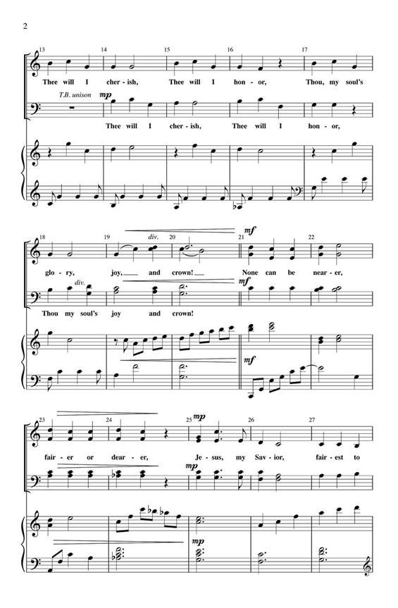 The familiar “Fairest Lord Jesus” text is dressed in a new musical garb with tasty harmonies and a captivating tune. The accompaniment begins simply as does the vocal writing. As the piece progresses both entities are opened up like a meadow of flowers moving to full bloom. Appropriate for almost any service of worship, it is easy to medium in difficulty.