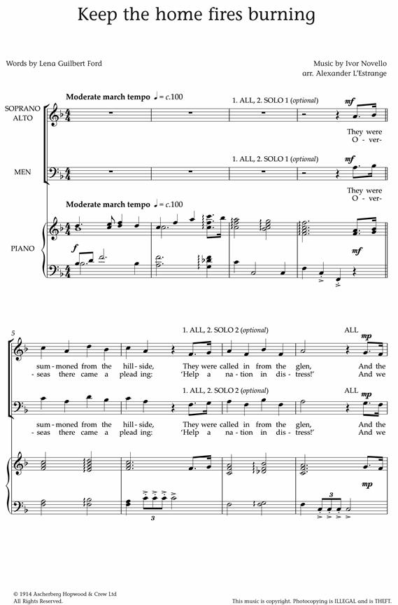 Songs of Wartime contains three varied songs associated with the First World War, skilfully arranged by Alexander L’Estrange. A rousing march (It’s a Long Way to Tipperary), a hopeful ballad (Keep the Home Fires Burning), and a wistfully romantic song (If You were the Only Girl in the World), offer glimpses into the hearts and minds of those who lived during the ‘Great War’ – and are testimony to the powerful role of music in times of trouble.