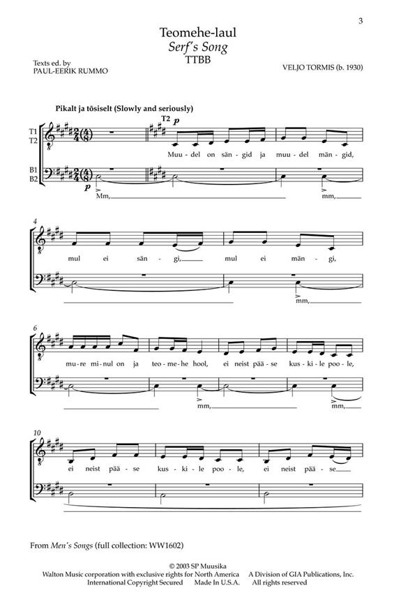 Teomehe-laul (Serf's Song). Muziek gebaseerd op een triest gedichtvan een arme man die ernaar verlangt zijn lasten neer te leggen. Op basis van de woorden die Jezus uitspreekt: Kom tot mij, allen die vermoeid en belast zijn. Gelijktijdig is het humoristische werk in een set.